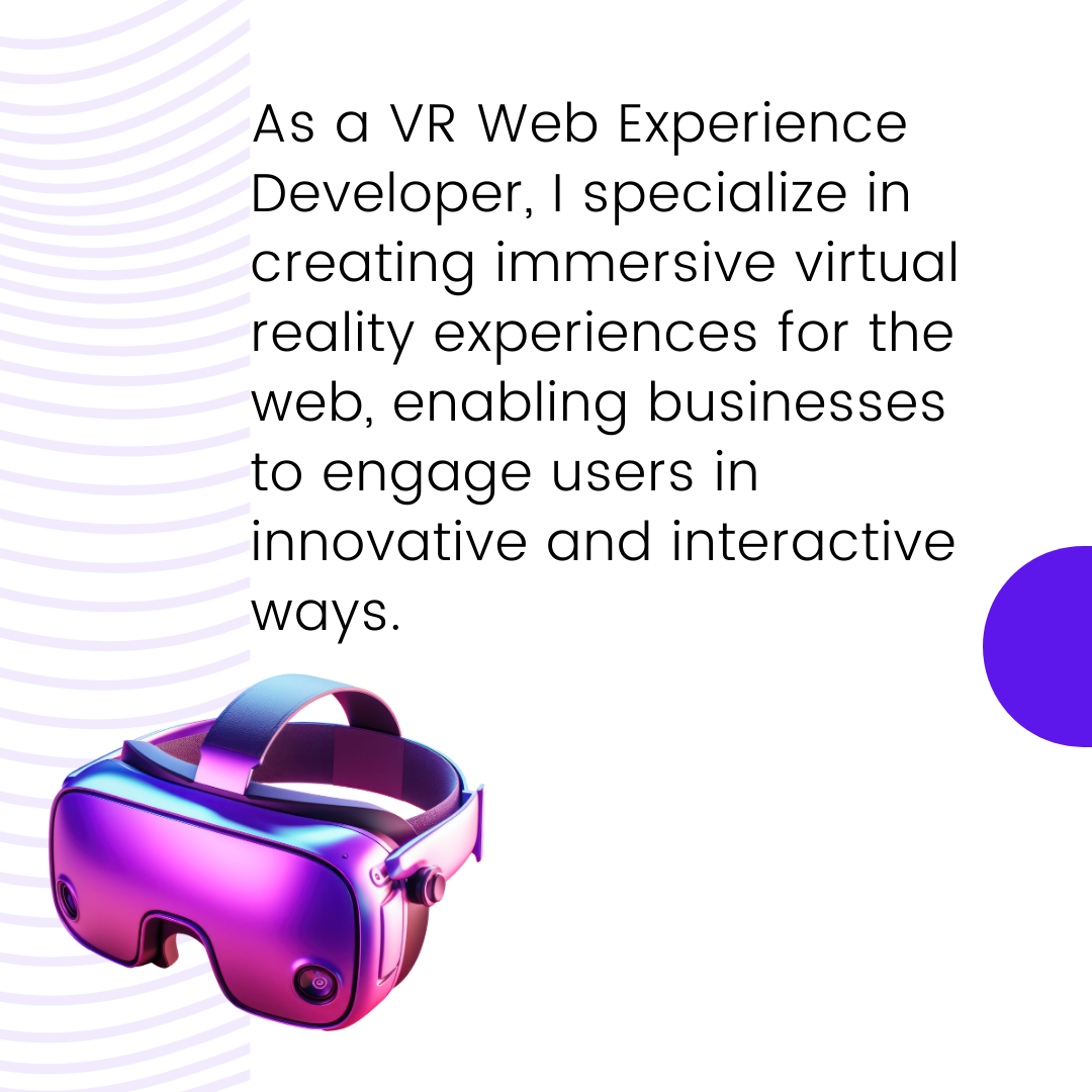 Hi there, I’m Mariia, a VR Web Experience Developer. I bring virtual reality experiences directly to web browsers, creating immersive, interactive environments that engage users across platforms. My work blends cutting-edge WebXR technology with 3D modeling and performance optimization to deliver seamless VR experiences without the need for additional hardware. Whether it’s virtual tours or product demos, I help businesses connect with their audiences in new, innovative ways.