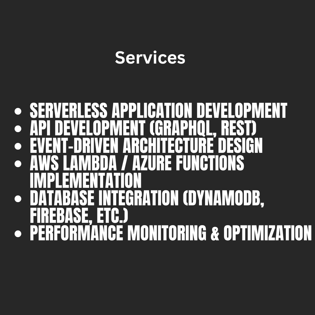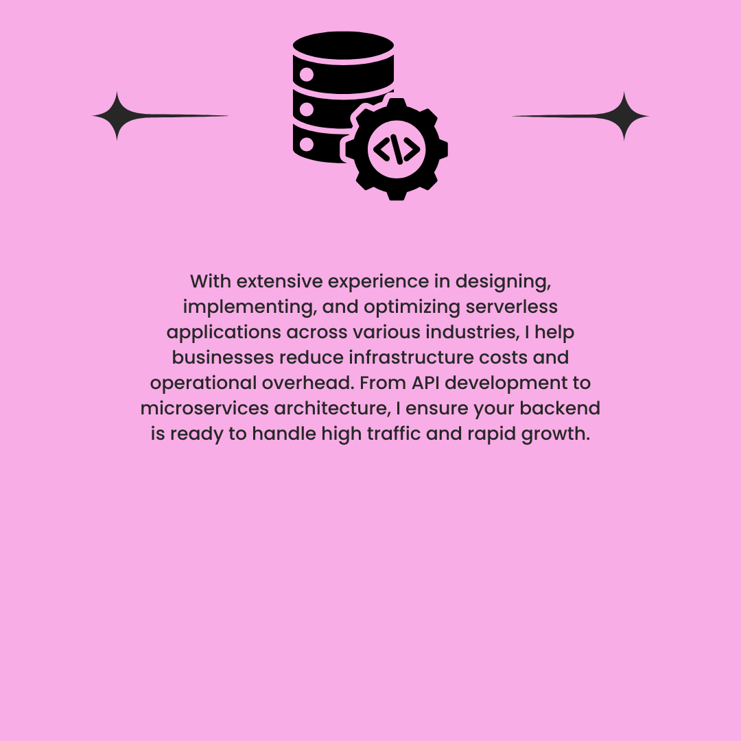 Implement and design scalable serverless backend systems that allow businesses to focus on their applications without worrying about server management. From real-time data processing to seamless API integration, my expertise ensures that businesses benefit from highly efficient and cost-effective serverless solutions. By leveraging AWS Lambda and Google Cloud Functions, I help businesses scale while maintaining optimal performance.