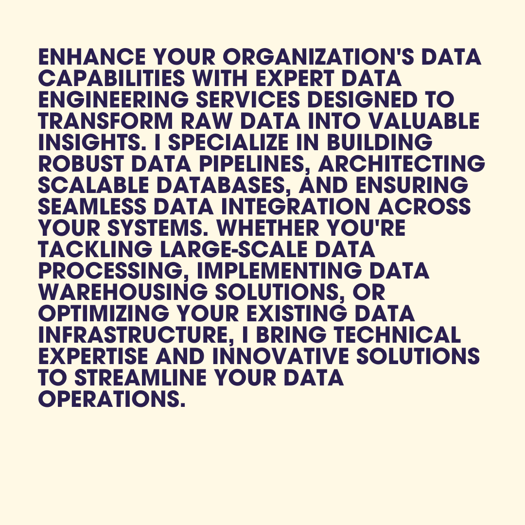 Design efficient data pipelines and manage big data systems, ensuring seamless storage, processing, and access to critical data. My expertise spans ETL/ELT pipelines, cloud infrastructure, and big data technologies, supporting businesses with reliable and scalable data solutions.