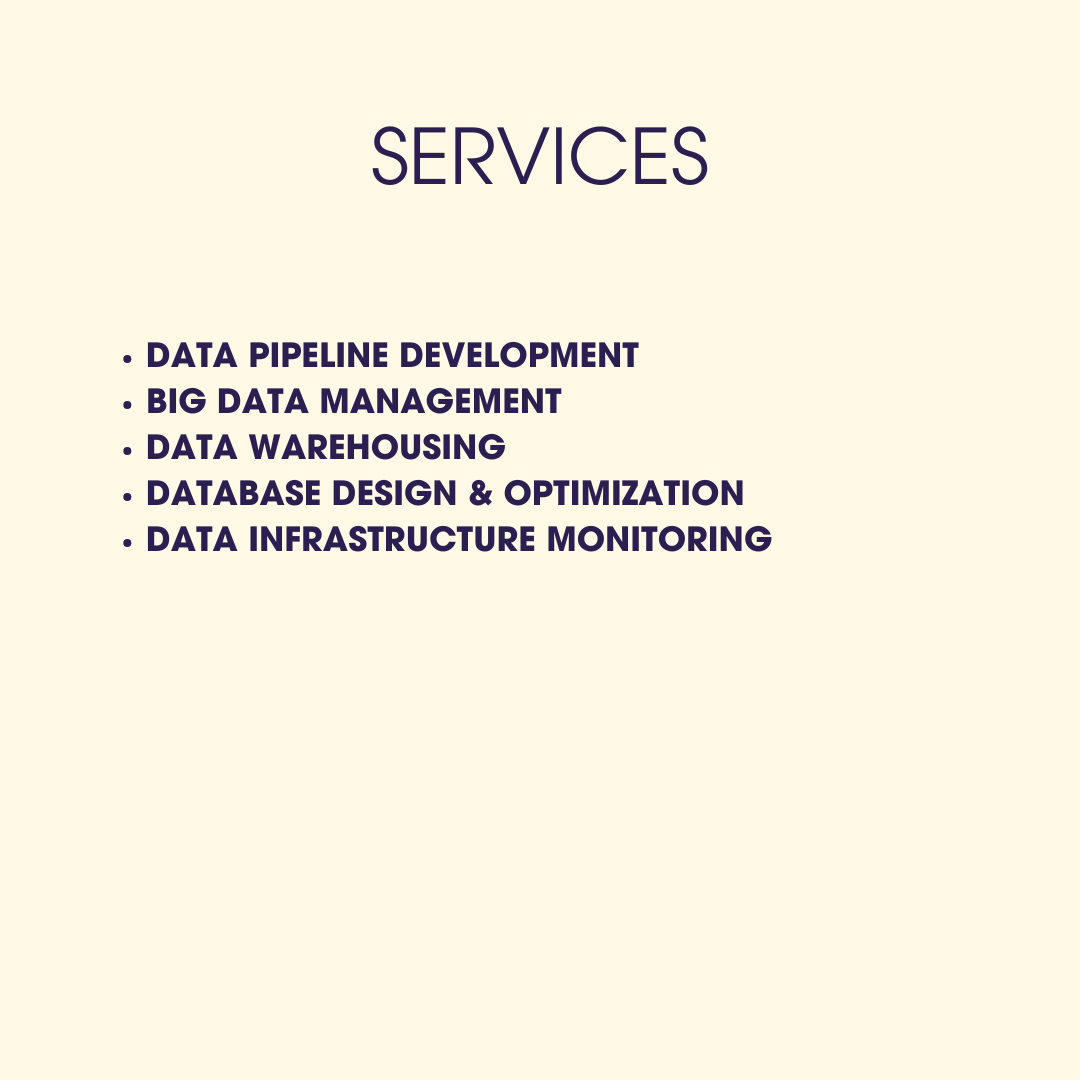 Description: Design and develop scalable data pipelines that automate the collection, transformation, and storage of data. We’ll ensure your data flows seamlessly through your systems, providing real-time, high-quality data for analysis and decision-making.