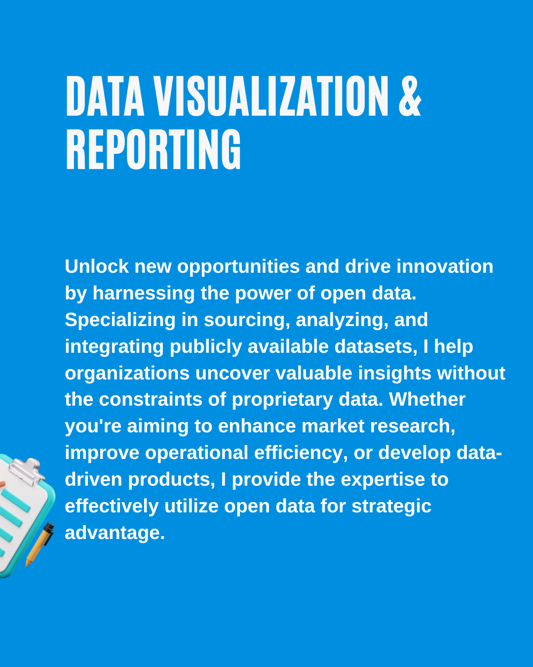 My experience in leveraging open data gives businesses and organizations the ability to make informed decisions using free, publicly available resources. I make sense of the data to uncover key insights.