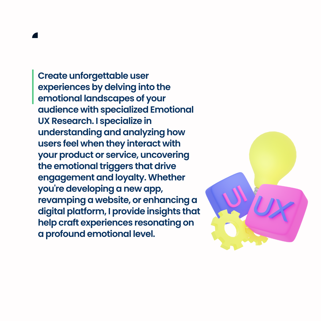 Description: Conduct in-depth emotional user testing to understand how users feel during their interaction with your product. By using techniques like facial expression analysis, physiological monitoring, and behavioral studies, we will identify emotional triggers and refine the UX to improve user engagement.