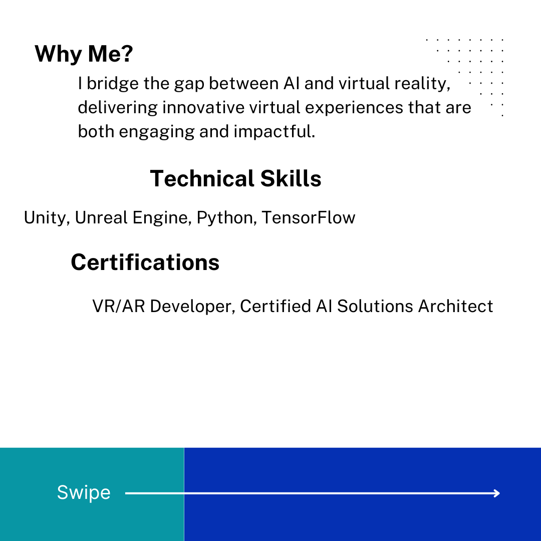 I bridge the gap between AI and virtual reality, delivering innovative virtual experiences that are both engaging and impactful.
