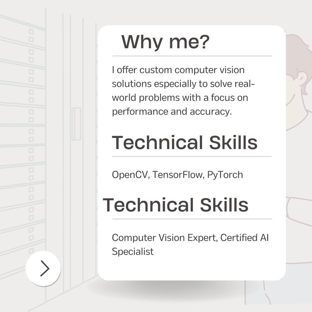 I develop computer vision systems that allow machines to understand and analyze visual data. Specializing in image recognition, object detection, and video analysis, I provide solutions that help businesses automate tasks and improve processes using visual inputs.