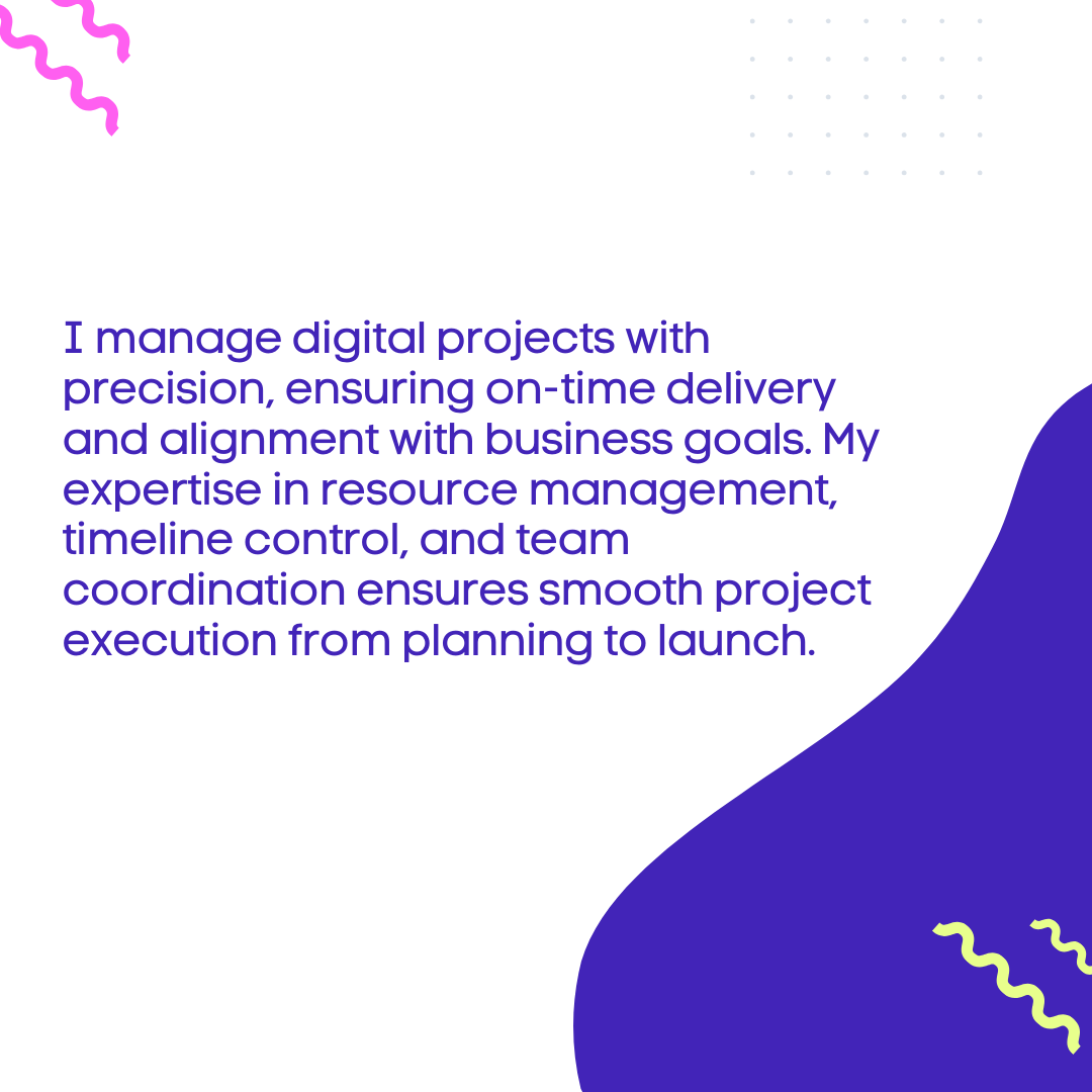 Do you need someone to take charge of your digital projects and ensure timely, within-budget delivery?I manage digital projects with precision, ensuring on-time delivery and alignment with business goals. My expertise in resource management, timeline control, and team coordination ensures smooth project execution from planning to launch.