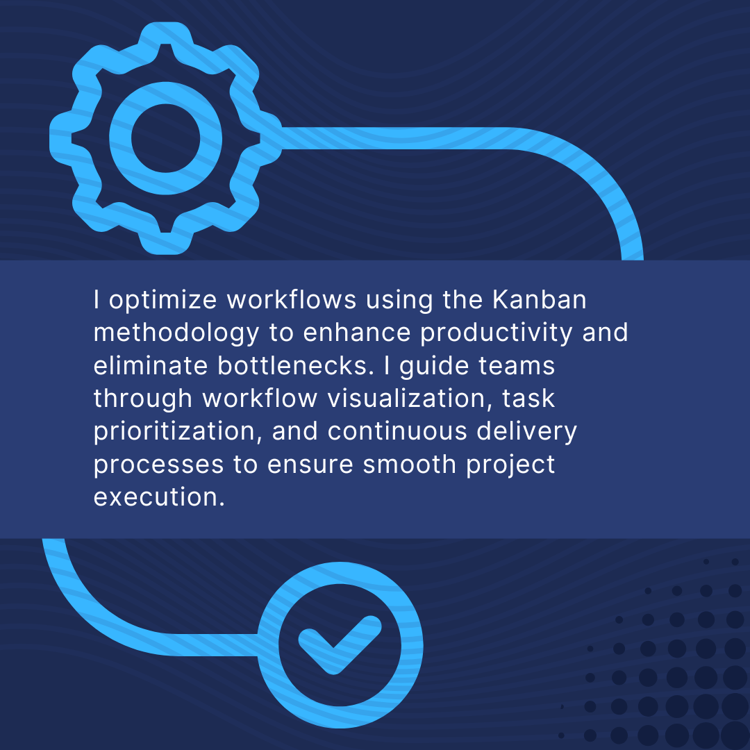 I optimize workflows using the Kanban methodology to enhance productivity and eliminate bottlenecks. I guide teams through workflow visualization, task prioritization, and continuous delivery processes to ensure smooth project execution.