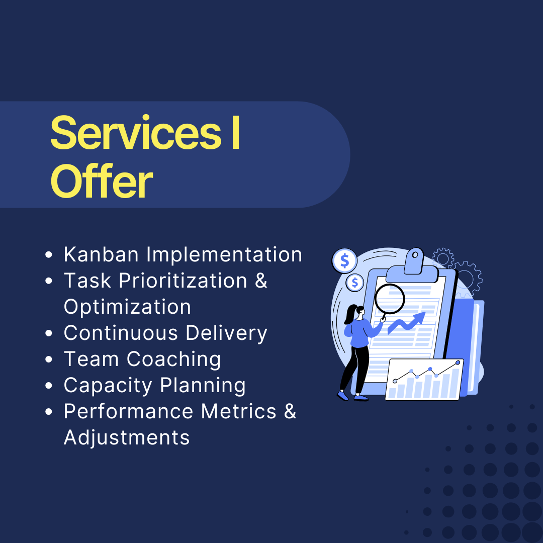 Description: Streamline your team’s workflow by implementing a customized Kanban system that fits your project requirements. We will help you set up and optimize Kanban boards, improve team collaboration, and reduce bottlenecks, ensuring that tasks flow smoothly from start to finish.